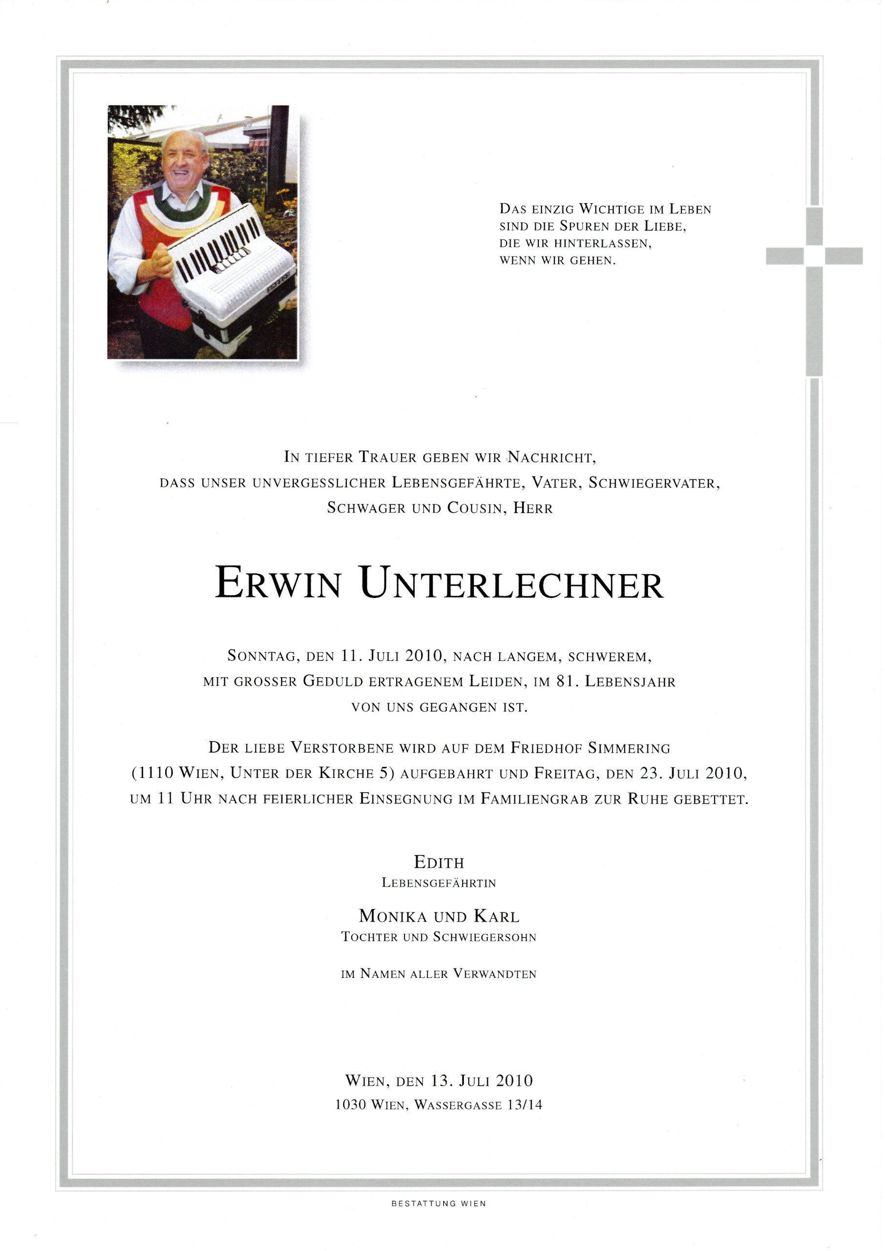 Erwin Unterlechner wurde am 24.11.1929 in Schwaz in Tirol als Sohn von Johanna Leitinger, Zementwarenerzeugerstochter, und Anton Unterlechner, Gefreiter im Tiroler Alpenjäger Regiment, geboren. 1934 erfolgte aufgrund des Wechsels des Vaters zur Bundessicherheitswache Wien der Umzug nach Wien. Die Eltern heirateten erst 1937, alles war immer abhängig von der beruflichen Tätigkeit des Vaters. Erwins Mutter bestand darauf, dass der Sohn Ziehharmonika lernt. Sie selbst war sehr musikalisch und auch sehr sportlich und in Tirol eine erfolgreiche Leichtathletin. Sie sagte immer, dass er mit dem Spielen auf einem Instrument immer Geld verdienen könnte. Erwin lernte zuerst eher unwillig, aber später mit großem Fleiß und die ersten Auftritte waren natürlich diverse Familienfeiern. Er erlernte den Beruf des Textilkaufmannes im Herrenmodensalon Franz in 1010 Wien, Freisingergasse 4/Petersplatz und wechselte danach als kfm. Angestellter zur Zentralsparkassa.