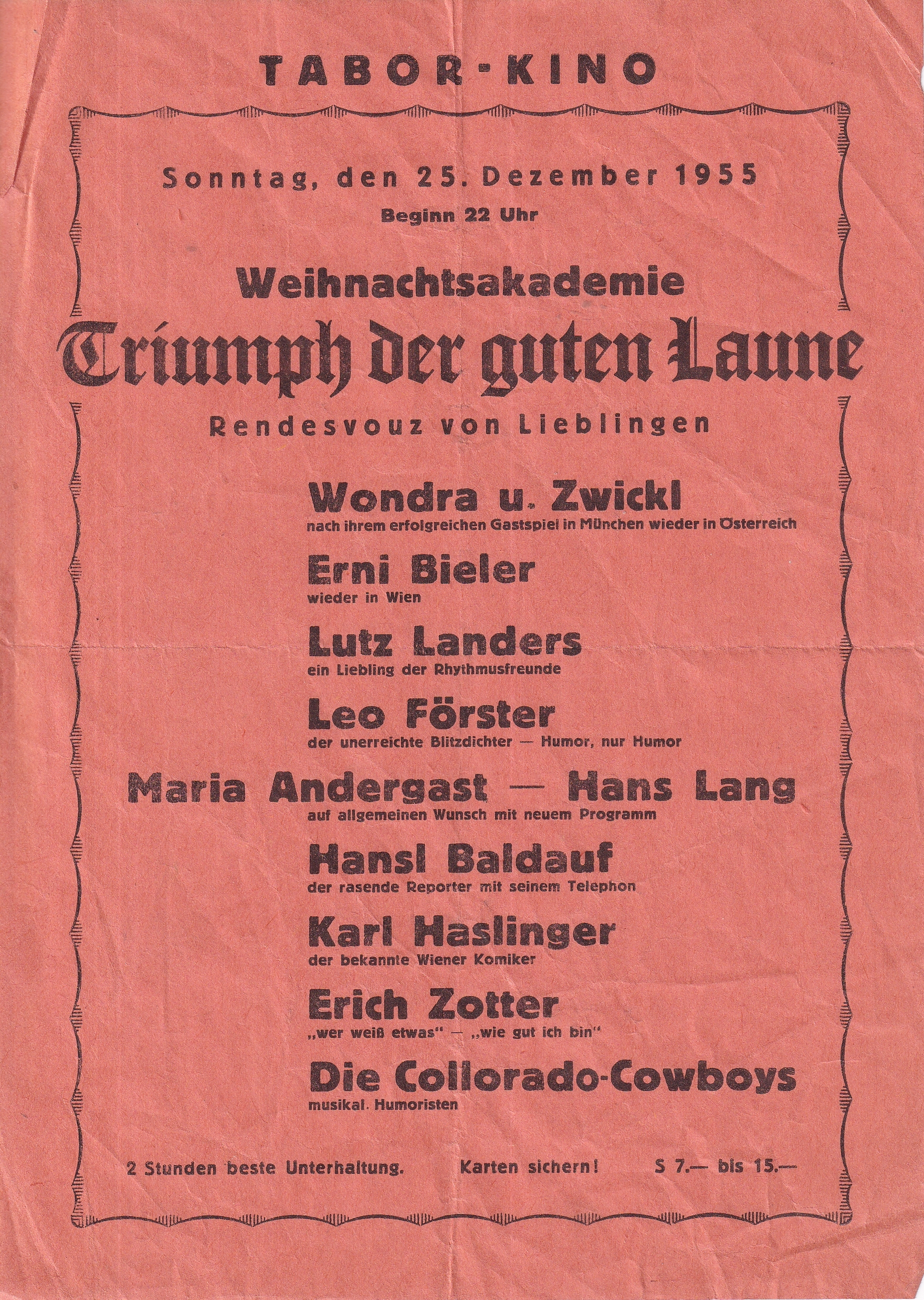 Gemeinsam mit „Kennst di aus“ Humorist Fritz Edtmeier waren die Optimisten die Urlaubsvertretung der Original Spitzbuben. Nach dem Ausscheiden von Julius Anstoss 1966 und einigen Versuchen einen Ersatz zu finden, z.B. mit Franz Krajcsir und Sängerin Alexandra, machte Erwin weiter im Duo mit Otto Fast, den er seit der Cowboy-Ära kannte. Ottos Interpretationen von „Schillers Glocke“ z.B. als Hans Moser, Theo Lingen oder Richard Romanowsky waren grandios – und nach dessen Tod im Jahre 1998 folgte Otto „Pauli“ Paulus, der in Kaiser Ebersdorf ein beliebter und bekannter Alleinunterhalter war (sein Paradelied „Morgen ja morgen fang ich ein neues Leben an“ von der EAV).