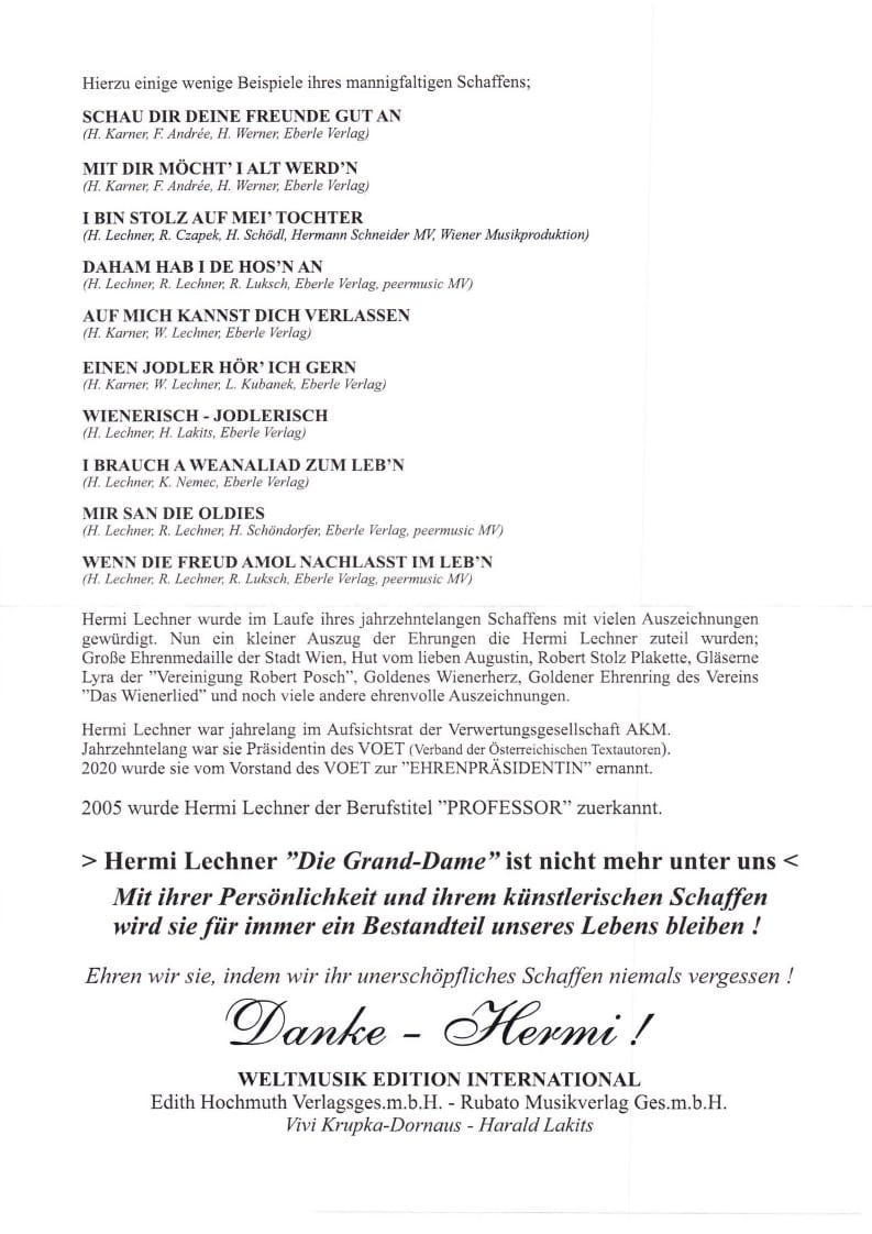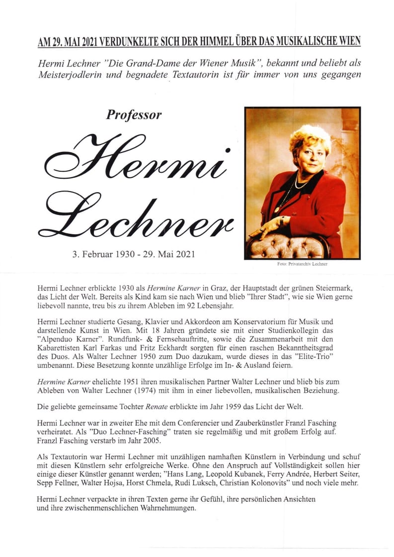 Hermi Lechner, geborene Karner, verehelichte Fasching, eine Textautorin und Interpretin der gehobenen Kategorie, hat sie,n ach dem Gymnasium, das Konservatorium für Musik und darstellende Kunst absolviert.