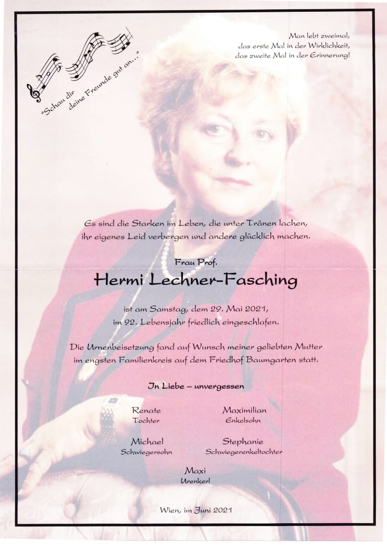 Leider ist Hermi Lechner am 29.05.2021 von uns gegangen. Wir werden Sie immer in Erinnerung behalten. Ruhe in Frieden.