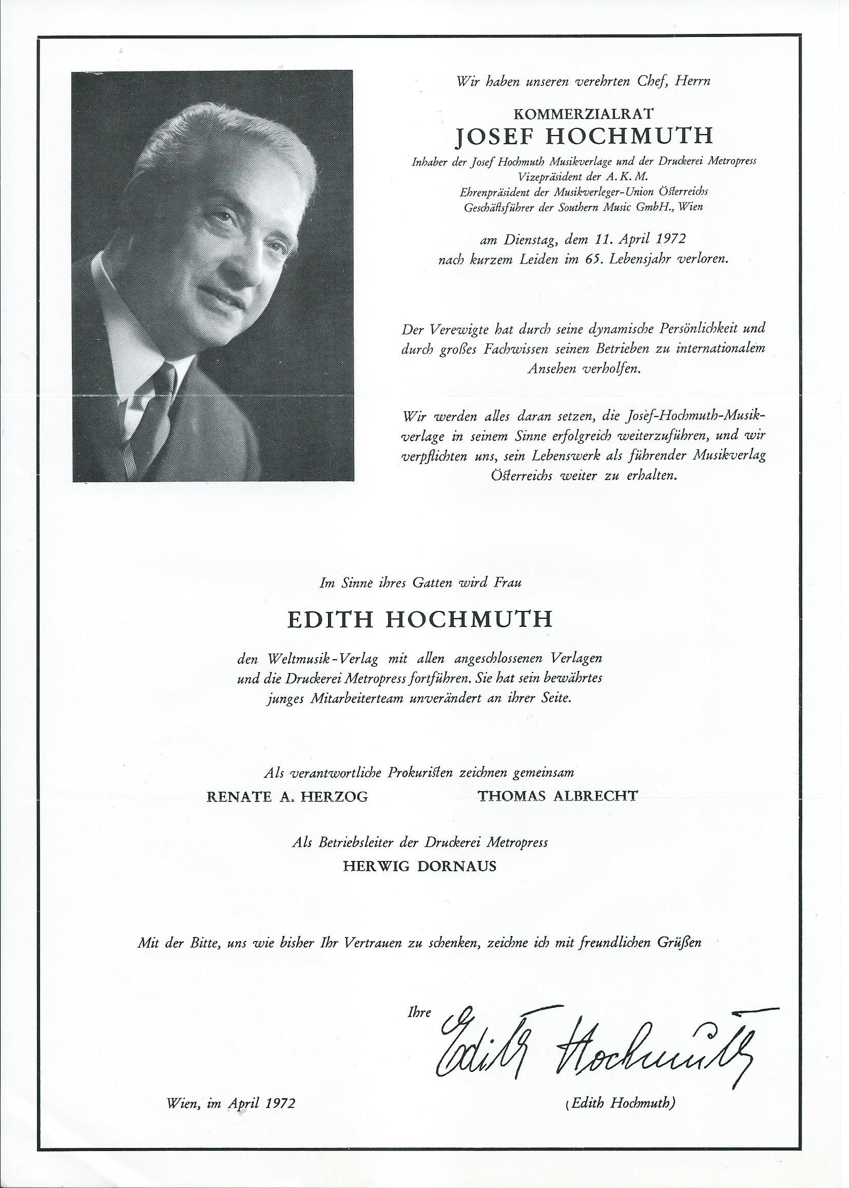 Er war Kommerzialrat, Vizepräsident der AKM gewesen, vielerlei Ehrungen hatte er erhalten, jedoch „Hochmuth”, wie gesagt, war nur sein Familienname.