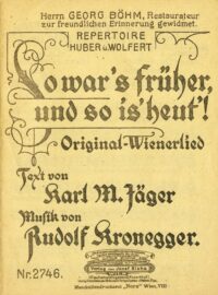 Als er seinerzeit auf die „Pawlatschen“ sprang, begann er auch Liedertexte und Couplets zu schreiben. Rudolf Kronegger, dem damals sehr populären Wiener Komponisten, fiel er auf und wenige Tage später entstand „O du süasse Weana Musi“, der Text vom Jäger, die Musik von Rudolf Kronegger.