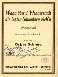 Dieser Abend hat Oskar Schima den Weg als Wienerlieder-Komponist geebnet. Und in der Folge schuf er ein Wienerlied nach dem andern, die die schöne Anzahl von 250 überschritten.