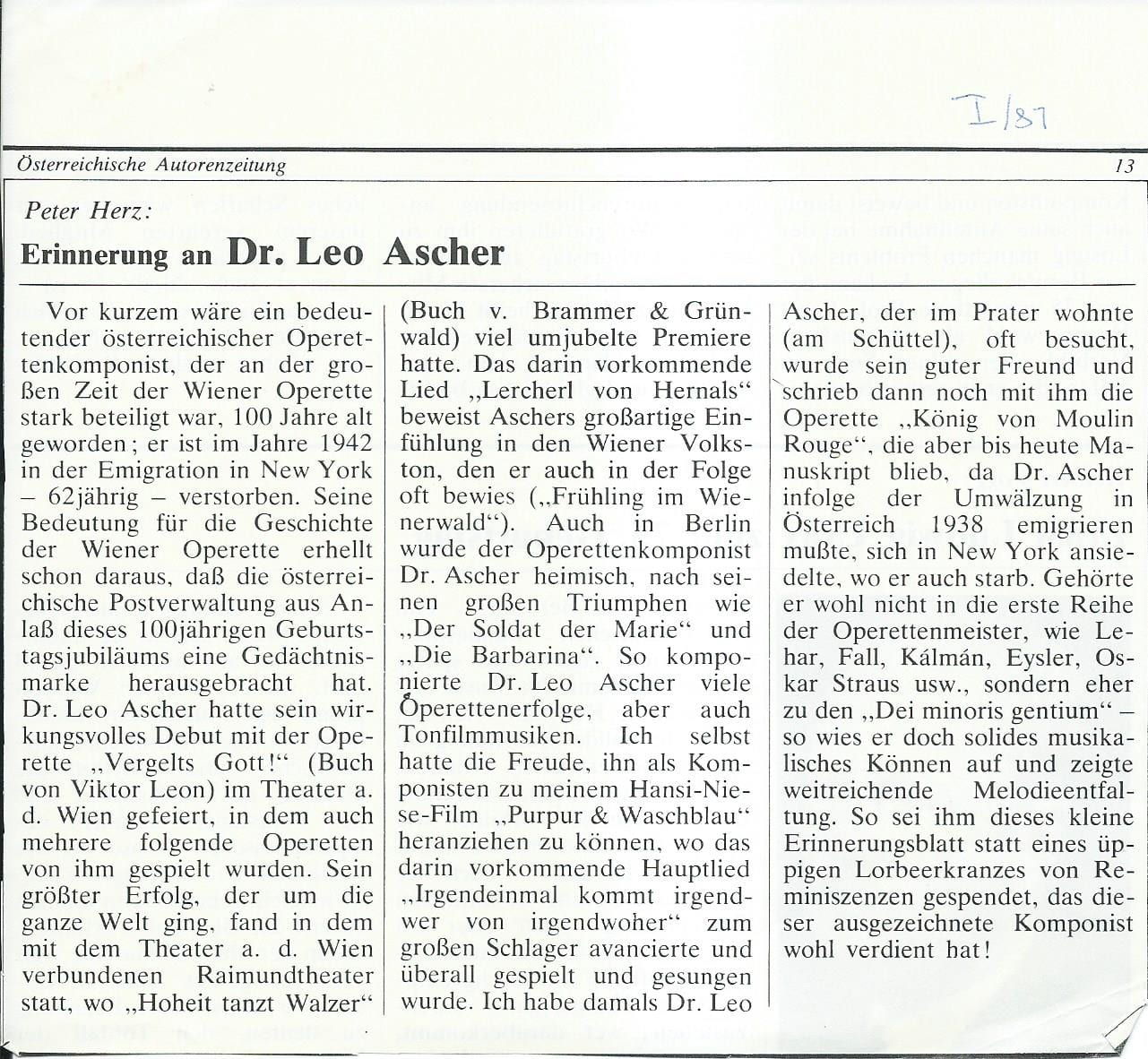 Mit Hermann Leopoldi als Komponist kamen Peter Herz‘ Texte, wie „mit dem Sch- Sch- Sch- Überraschungszug“, „Das kleine Kaffee in Hernals“, „Schön ist so ein Ringelspiel“, „A guater Tropfen, so dreimal täglich“, „In Hietzing am Platz ist heut Platzmusik“ heraus. Mit dem Komponisten Karl Föderl entstand „In Nußdorf da wachst der Nußberger“, da erwähne ich nur ein paar Titel seiner österreichisch-wienerischen Texte der Vorkriegszeit. Herz schrieb u.a. für die Volksschauspielerin Hansi Niese das Buch zur Revue „Rund um die Niese“, das Drehbuch zum Film „Purpur und Waschblau“, in welchem dieselbe eine Doppelrolle spielte und das Lied „Irgendeinmal kommt irgendwer von irgendwoher und nimmt dein kleines Herzchen mit und macht dich glücklich“ – die Noten dazu stammten von Leo Ascher.