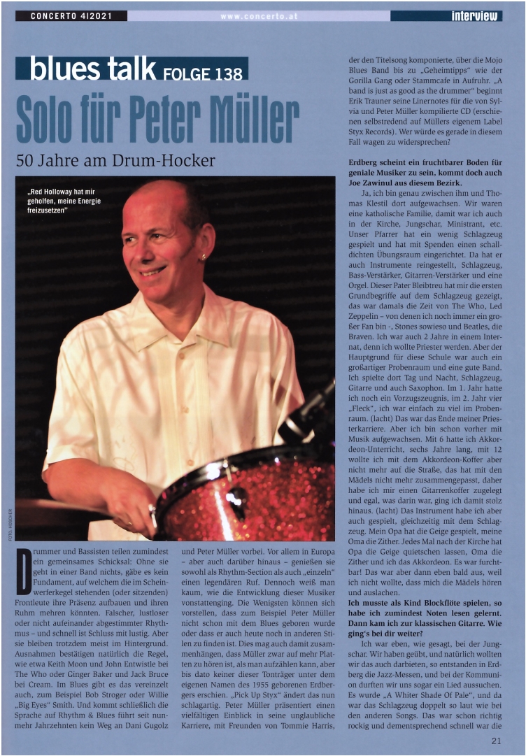 Eine Anzeige in einer deutschen Drummerzeitschrift sollte Peter Müllers Leben einschneidend verändern – es wurde ein Schlagzeuger für eine österreichische Bluesband gesucht, nämlich für niemand geringeren als die „Mojo Blues Band“, bei der er die Chance bekam, festes Mitglied zu werden. Bald hängte Peter seinen zivilen Job als Metallbautechniker an den Nagel und stürzte sich mit Haut und Haar auf den Blues. Er erweiterte seine Schlagzeugkenntnisse an der Universität für Musik und Darstellende Kunst in Wien, bei Leonardo in der Schweiz und bei Workshops in Österreich, Deutschland, der Schweiz und Los Angeles, USA. Sein inneres, instinktives Rhythmusgefühl konnte er bei Vorlesungen an der Universität Wien, im Studienzweig Ethnologie, näher erforschen und vertiefen. Zwölf Jahre lang war Peter festes Mitglied der „Mojo Blues Band“ und lernte die Bluesmusik in all ihren Facetten kennen. Bei mehr als einem Dutzend MBB-CDs ist er am Schlagzeug zu hören, Kontakte und Konzerte mit unzähligen internationalen Bluesleuten vervollständigten sein musikalisches Leben: Jimmy McCracklin, Champion Jack Dupree, A.C.Reed, Bob Gaddy, Larry Dale, Little Willie Littlefield, Katie Webster, Red Holloway, Eddie C.Campbell, Big Smokey Smothers, Jay McShann, Axel Zwingenberger, Louisiana Red, Big Jay McNeely, Dana Gillespie, Sister Shirley, Clarence Hollimon, Jimmy Anderson, Johnnie Allan, Jannick Monot und viele mehr. Zu jener Zeit entstanden auch schöne Bluesaufnahmen zusammen mit dem Pianisten Henning Pertiet. Mit den Mojos erlebte Peter nicht nur den nationalen und internationalen Tourneebetrieb, sondern hatte dazu noch das Glück, das Leben afro-amerikanischer Musiker und darüber hinaus die Chicagoer Bluesszene kennen zu lernen. Mit einigen Mojo-Kollegen machte er auch einen kurzen Abstecher in die Country & Western Musik mit den „Honky Tonk Playboys“ – zu hören auf der bemerkenswerten, durchwegs positiv rezensierten STYX CD-1044.